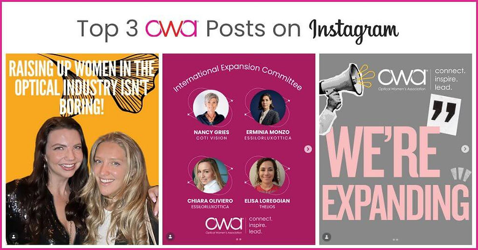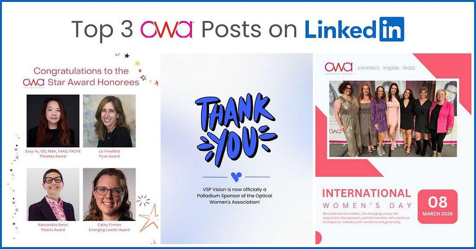 Die Optical Women's Association (OWA) weiß, wie man Aufmerksamkeit erregt. Von der Würdigung herausragender Mitglieder bis hin zur Hervorhebung von Führungspersönlichkeiten und wichtigen Momenten – die erfolgreichsten Social-Media-Beiträge der OWA fangen die Energie, die Wirkung und den Gemeinschaftssinn ein, die das Herzstück der Organisation bilden. In diesem Beitrag stellen wir einige der ansprechendsten Social-Media-Momente der OWA vor und erklären, warum sie so viel Anklang fanden. Hier sind die erfolgreichsten Beiträge der einzelnen Plattformen für das erste Quartal 2026, erstellt vom OWA Digital Marketing Committee .